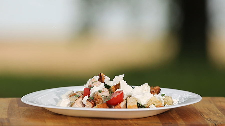 В салате от нашего шеф-повара сочетаются индейка с ароматными травами, обжаренный на гриле хлеб, томаты и сыр фета. Вам понравится блюдо по рецепту рубрики "Фуд-корт".