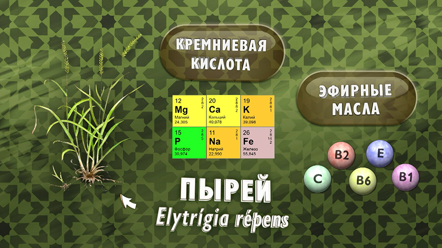 Пырей богат такими минералами, как магний, кальций, калий, фосфор, натрий, железо. В растении присутствуют витамины С, Е и группы В. Кроме того, пырей насыщен кремниевой кислотой и эфирными маслами, содержит полисахариды, флавоноиды и сапонины. Самое ценное соединение – это кремниевая кислота. Недостаток кремния приводит к тому, что витамины и минералы плохо усваиваются организмом.