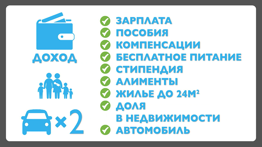 Из чего складывается доход? Это зарплата, пособия, компенсации, например за услуги ЖКХ или питание в детском саду, стипендия детей. Если мама и папа в разводе, в расчёт берутся алименты. Учитывается также жильё: на каждого члена семьи приходится не больше 24 квадратных метров. Если у ребёнка есть доля в квартире бабушки, её зачтут, даже если он там не живёт. Допускается только одно транспортное средство. Исключение – многодетные родители, они могут владеть двумя машинами.