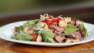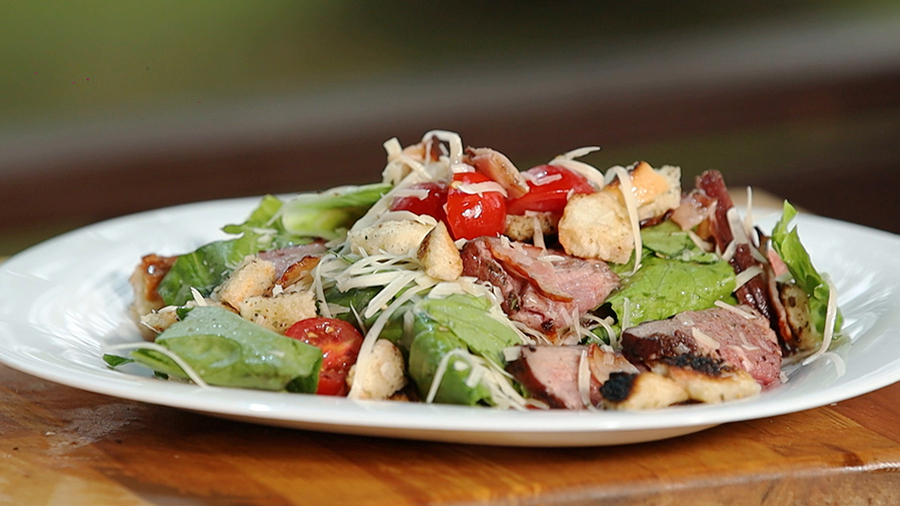 Салат из мяса, сухариков и бекона – отличная закуска для семейного обеда. Рецепт блюда от нашего шеф-повара вы найдёте в "Фуд-корте".