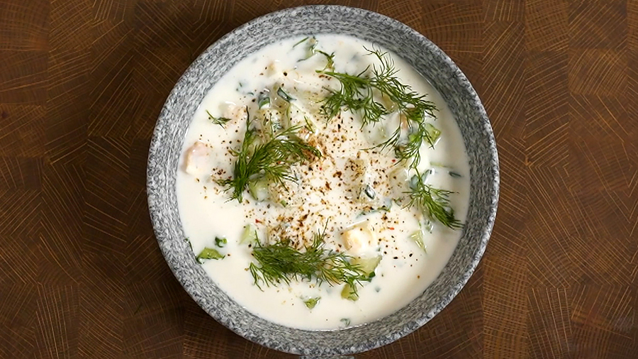 Лёгкая окрошка на кефире с картошкой, яйцом, зелёным луком, свежим огурцом и зеленью станет отличным выбором для тех, кто решил похудеть.