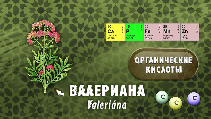 В состав корня валерианы входят витамин С, гликозиды, дубильные вещества, минералы (кальций, фосфор, железо, марганец, цинк), а также органические кислоты. Корень растения содержит эфир изовалериановой кислоты. Эти вещества отличаются тем, что придают человеку спокойствие и уверенность.