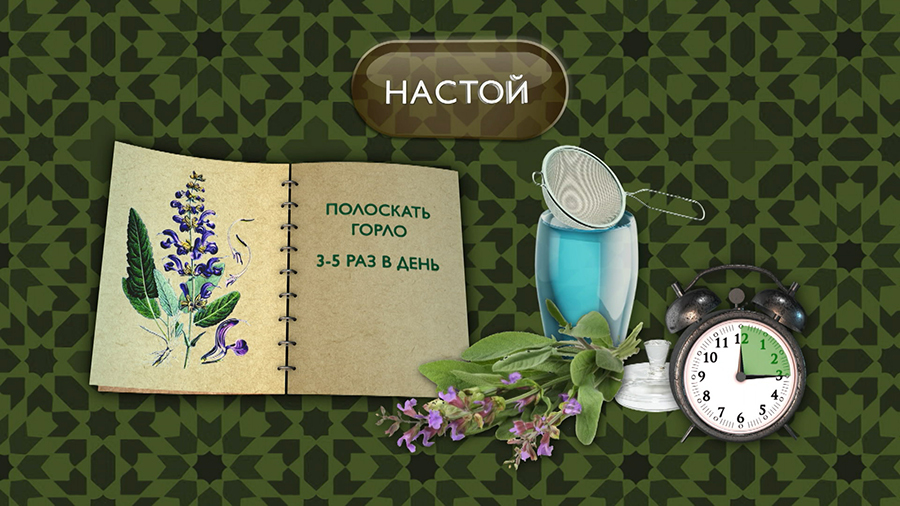 Для полоскания горла приготовьте настой. Одну-две чайных ложки сухих листьев шалфея залить кипятком (200 мл), настоять 10-15 минут, затем процедить. Полоскать горло тёплым настоем необходимо не менее 3-5 раз в день.