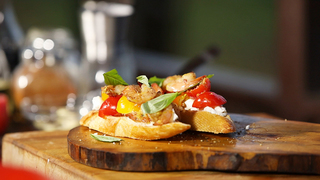 Ломтики хлеба с козьим сыром, томатами черри и креветками приготовит наш шеф-повар. Вам понравится брускетта по рецепту рубрики "Фуд-корт".