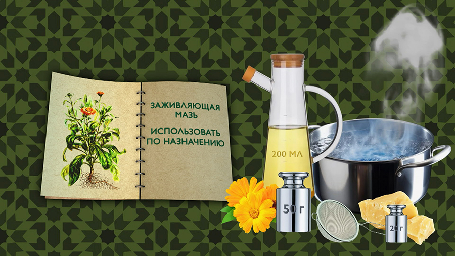 Чтобы сделать заживляющую мазь, возьмите 50 граммов сухих цветков календулы и залейте их оливковым маслом. Дайте настояться две недели в тёмном месте. После процедите и смешайте с пчелиным воском, предварительно растопленным на водяной бане.