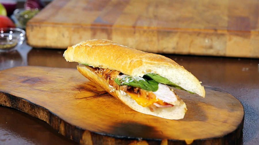 Горячий бутерброд с куриным филе, беконом, сыром и шпинатом приготовит на гриле наш шеф-повар. Рецепт блюда вы найдёте в рубрике "Фуд-корт".