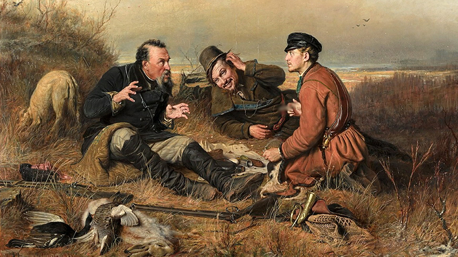 Перов был страстным охотником. Кстати, русская псовая охота уникальна: в других странах охотились либо с гончими, либо с борзыми, а у нас – с теми и другими одновременно. В 1870-х годах Перов создаёт так называемую "охотничью серию". Но самая большая известность досталась работе "Охотники на привале". Он хотел написать картину-шутку, чтобы все видели, как охотники рассказывают какие-то байки.