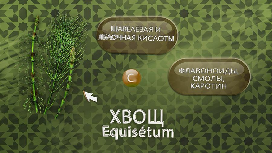 Хвощ содержит кремниевую, дубильную, глицериновую, цикориевую, щавелевую, яблочную и другие кислоты. Кроме этого, растение богато флавоноидами и смолами, а также является источником каротина и витамина С.