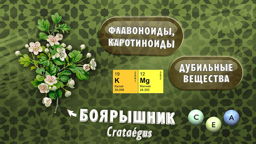 В состав боярышника входят: витамины С, А, Е, минералы (калий, магний), флавоноиды, каротиноиды, дубильные вещества, эфирное масло, кверцетин, а также разные кислоты. Флавоноиды (гиперозид, кверцетин) улучшают кровообращение, помогают сосудам. За счёт этого боярышник укрепляет сердечную мышцу, нормализует давление и ритм сердца при аритмии и тахикардии.