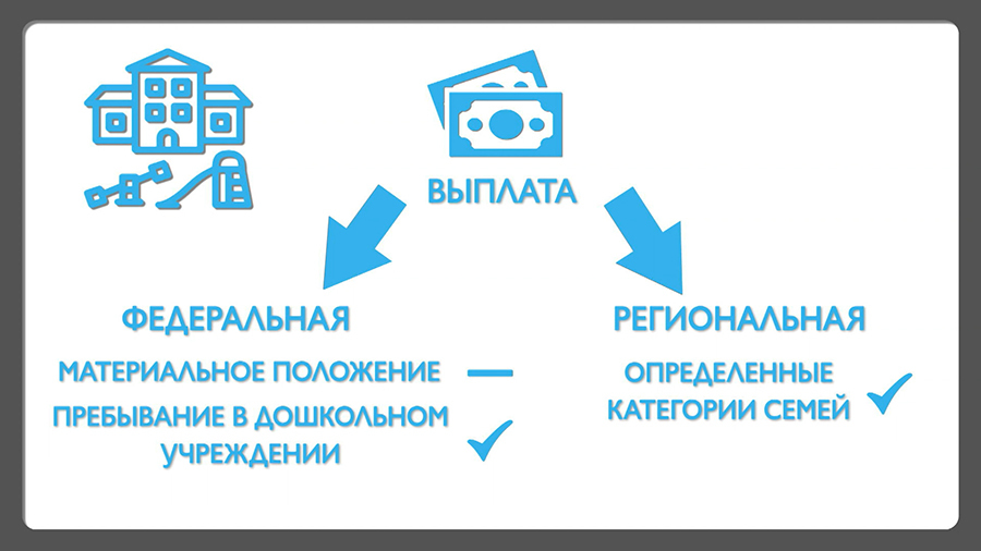 Компенсация за детский сад бывает двух видов. Федеральная действует по всей России и не зависит от материального положения семьи. Выплату назначают на весь период пребывания ребёнка в дошкольном учреждении. Вторая – региональная, её выплачивают по решению субъекта некоторым категориям семей.