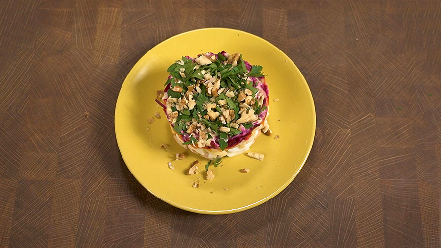 Если надоели селёдка под шубой и оливье, приготовьте салат из куриной грудки, яиц, моркови, свёклы и заправьте его сметанно-горчичным соусом.