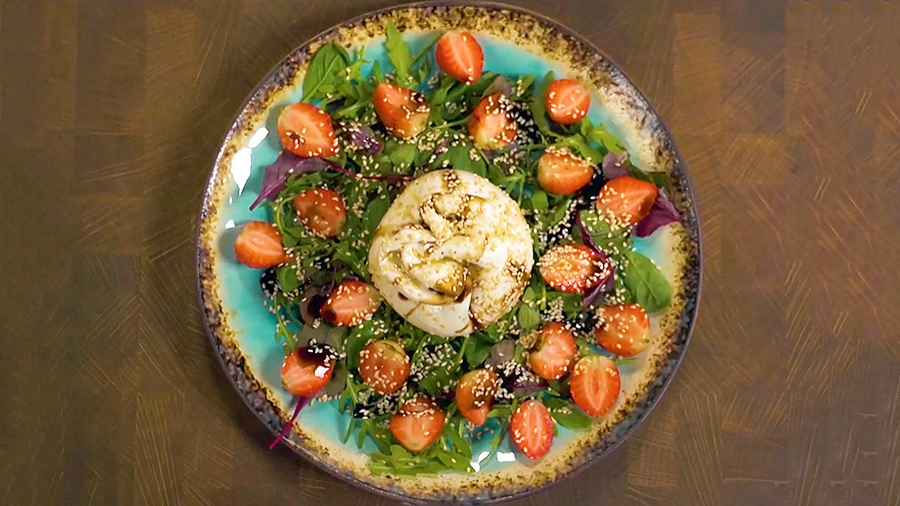 Попробуйте лёгкий салат с сыром буратта, зеленью, кунжутом и свежей клубникой. Аромата блюду придаст соус на оливковом масле с лимоном и мёдом.