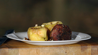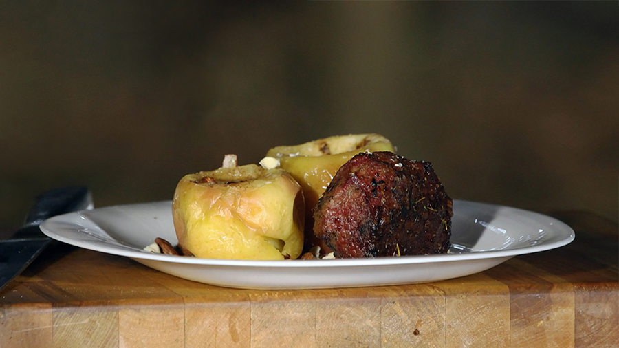 Мясо с запечёнными яблоками, корицей и миндальными орехами приготовит на гриле наш шеф-повар. Попробуйте это ароматное и вкусное блюдо по рецепту рубрики "Фуд-корт".