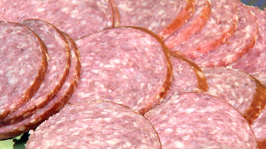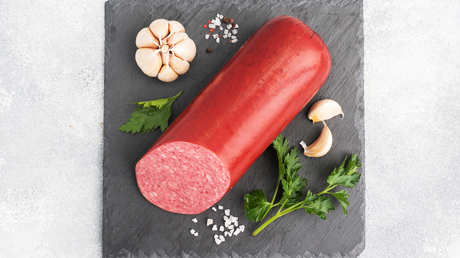 В основе классического рецепта – говядина, свинина и шпик. Последний на производствах обязательно хорошенько замораживают – так после измельчения он сохранит структуру и обеспечит тот самый узнаваемый пёстрый рисунок на срезе и, конечно, неповторимый вкус! За него также отвечают специи: кардамон, перец – белый и чёрный, мускатный орех.