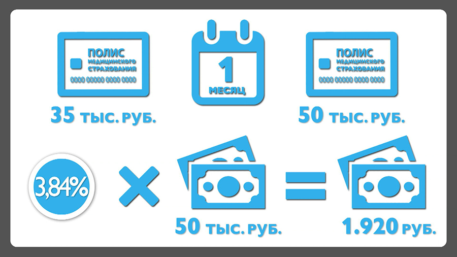 Чтобы получать пособие, сначала нужно внести определённую сумму страхового взноса. Расчёт следующий. На выбор даются две страховые суммы – 35 тысяч рублей и 50 тысяч рублей. Столько можно будет получить за месяц больничного. От этой суммы зависит размер и ежемесячных страховых взносов. Законом установлен тариф 3,84%. Умножаем, например, на 35 тысяч рублей. Получается, в месяц надо перечислять 1344 рубля. Если же выбрана страховая сумма 50 тысяч рублей, тогда ежемесячно необходимо перечислять 1920 рублей.
