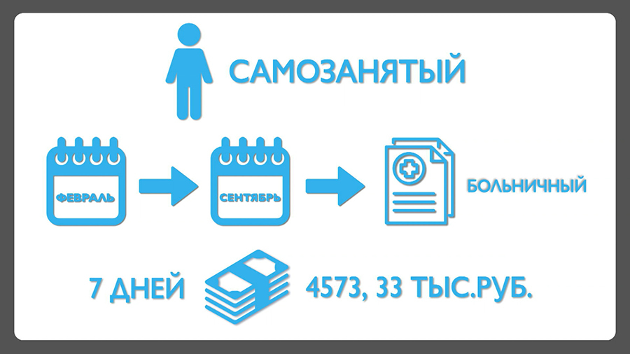 Есть ещё один важный момент, который влияет на размер пособия, это трудовой стаж. Допустим, раньше самозанятый работал по трудовому договору и уже имеет общий стаж шесть лет. Он выбрал страховую сумму 35 тысяч рублей, с февраля начал платить взносы, в сентябре заболел и берёт больничный на неделю. Получается, что за неделю болезни самозанятый сможет получить 4500 рублей.