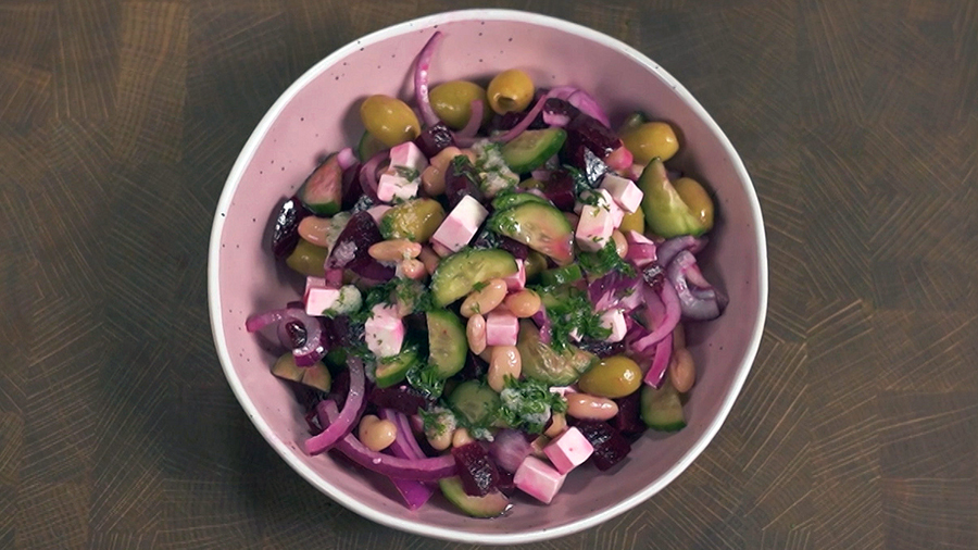 Приготовьте сытный и невероятно красивый салат из красного лука, свёклы, консервированной фасоли, оливок и сыра фета с добавлением ароматной заправки.