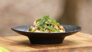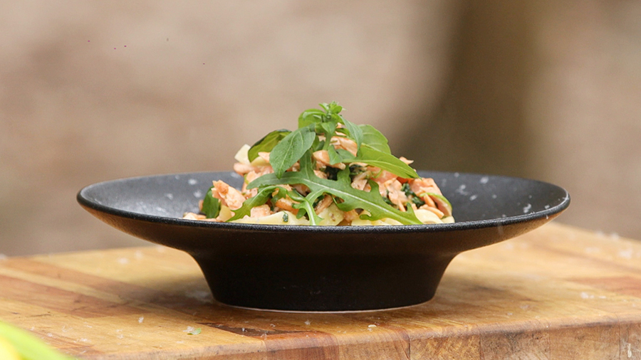 Лапшу с сёмгой и руколой на оливковом масле приготовит наш шеф-повар. Рецепт красивого и ароматного блюда в итальянском стиле вы найдёте в рубрике "Фуд-корт".