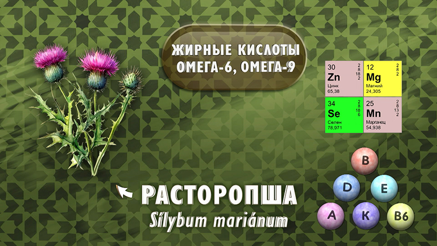 В состав расторопши входят: витамины А, D, К, Е и группы В, микроэлементы: цинк, магний, селен, марганец, жирные кислоты (омега-6 и омега-9).