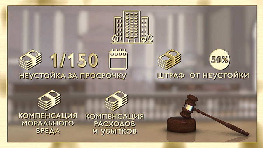 По закону, дольщик имеет право на неустойку за просрочку. Её размер – 1/150 ставки рефинансирования ЦБ от стоимости квартиры за каждый день. В интернете вы можете найти калькуляторы, которые автоматически посчитают и количество дней, и ставку. Застройщик обязан выплатить штраф в размере 50% от суммы, присуждённой судом, за то, что не договорился с дольщиком до суда. Также можно требовать компенсации морального вреда. Ну и конечно, сюда включаем возмещение судебных расходов и понесённых убытков. К ним можно отнести расходы на аренду жилья.