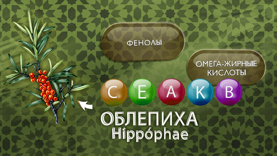 Основные действующие вещества облепихи – витамины C, Е, А, К и группы B, фолиевая кислота, омега-жирные кислоты, фенолы. Важны также каротиноиды, флавоноиды, органические кислоты – они отвечают за противовоспалительное, регенерирующее действие. Богато растение микроэлементами – железом, магнием и калием.