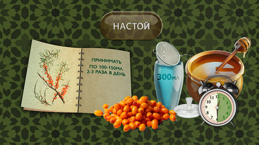 Классический настой из облепихи в виде чая готовится следующим образом. Две столовые ложки свежих или сухих ягод залить кипятком, настоять полчаса, затем процедить. Пить по 100–150 миллилитров два–три раза в день, можно с мёдом.