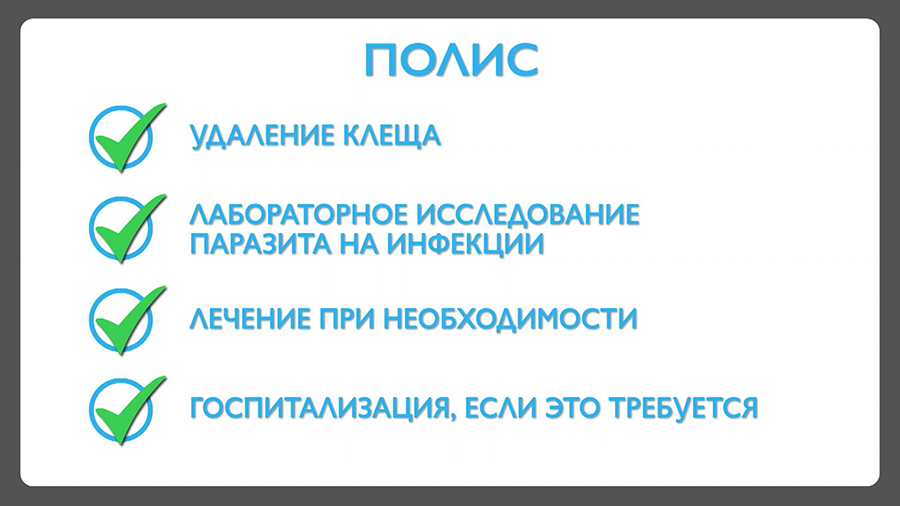 При оформлении полиса обращайте внимание на риски и услуги, которые включены в полис. Самый лучший вариант, если там указаны все этапы: удаление клеща, лабораторное исследование паразита на инфекции, лечение при необходимости, госпитализация, если это потребуется.