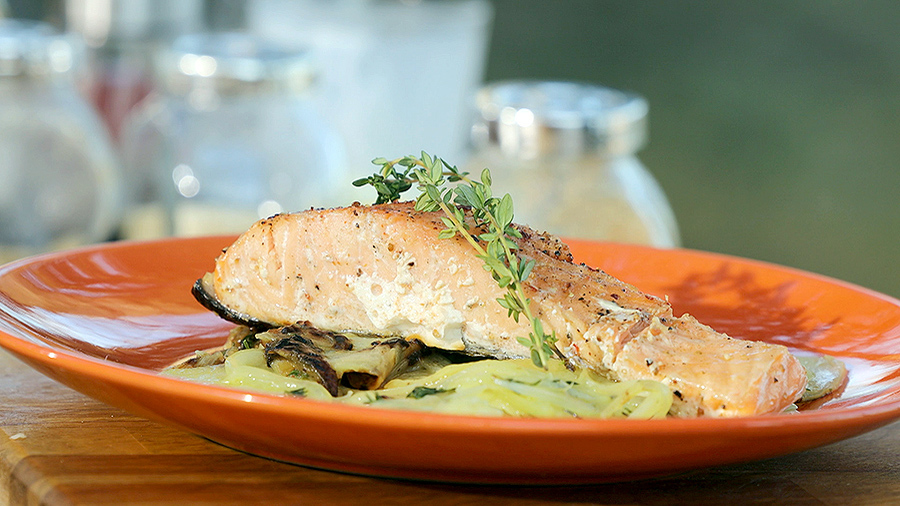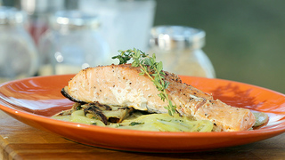 Рыбу на подушке из картофеля и лука приготовит наш шеф-повар. Рецепт сёмги с тимьяном и перцем вы найдёте в рубрике "Фуд-корт".