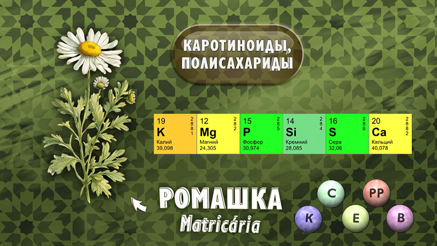 В химический состав ромашки лекарственной входят: эфирное масло, дубильные вещества и горечи, каротиноиды, полисахариды, органические кислоты, флавоноиды, витамины К, С, Е, РР и витамины группы В, а также калий, магний, фосфор, кремний, сера, кальций.