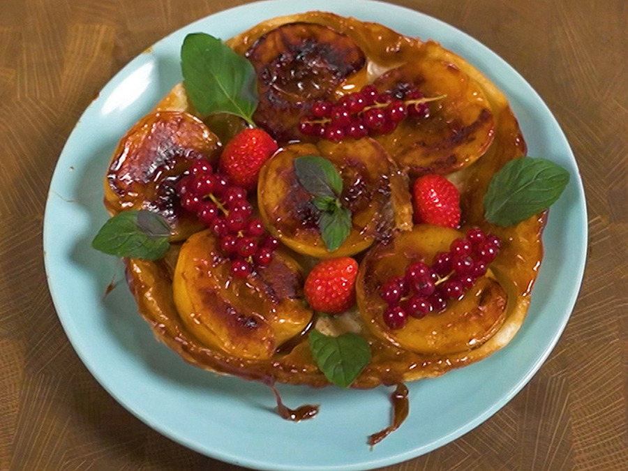 Ароматные персики с кленовым сиропом и корицей послужат основой пирога во французском стиле. Украшением блюда станут свежие ягоды и листики мяты.