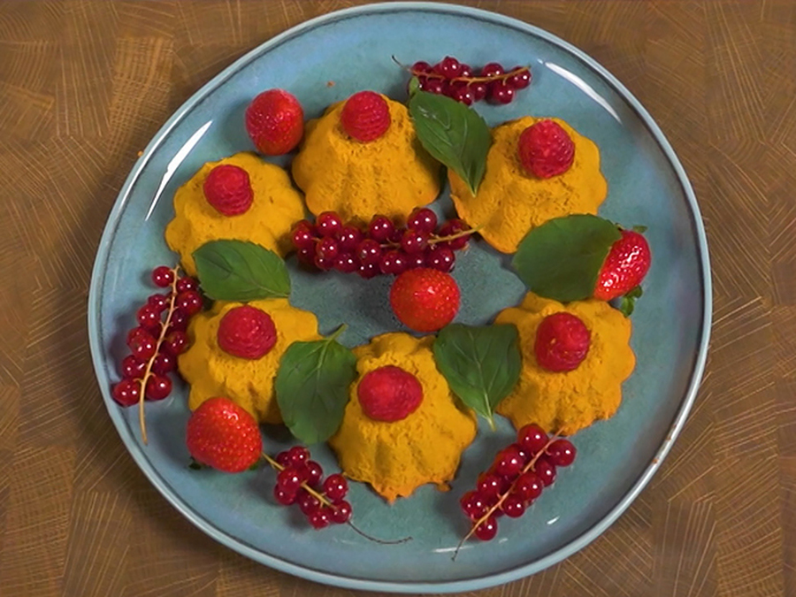 Попробуйте морковный десерт на рисовой муке, который можно есть на любой диете. Украшением блюда послужат красная смородина, клубника, малина и листья мяты.