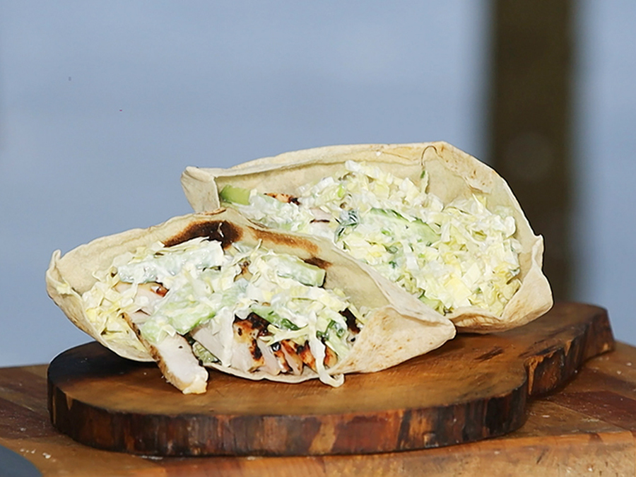 Маринованный лук, томаты черри, огурцы и йогуртовый соус идеально сочетаются с курицей от нашего шеф-повара. Вам понравится пита по рецепту рубрики "Фуд-корт".
