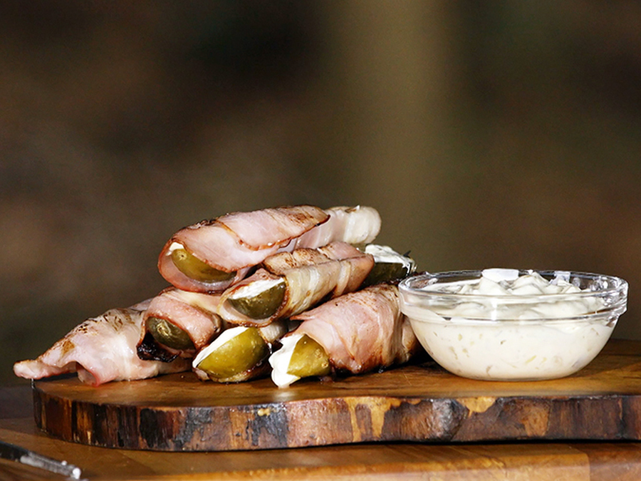 Пикантную закуску приготовит наш шеф-повар. Вам понравятся копчёные огурчики в беконе с начинкой из крем-чиза по рецепту рубрики "Фуд-корт".