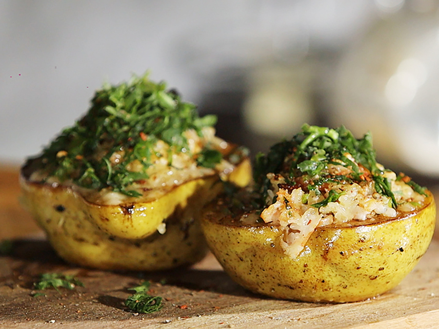 Изысканную горячую закуску приготовит наш шеф-повар. Рецепт груши с начинкой из креветки, кинзы и сыра вы найдёте в рубрике "Фуд-корт".