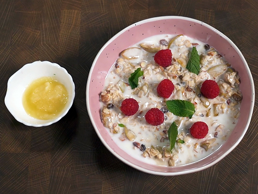 Попробуйте новое прочтение самого популярного завтрака, приготовив овсяную кашу на кефире с добавлением груши, миндаля, свежих ягод малины и листиков мяты.