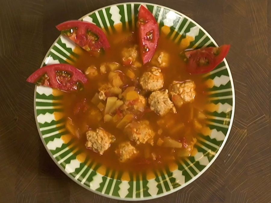 Томаты в собственном соку, морковь, картофель и чеснок станут основой вкусного и полезного супа. Добавлением к блюду послужат фрикадельки из куриного фарша.