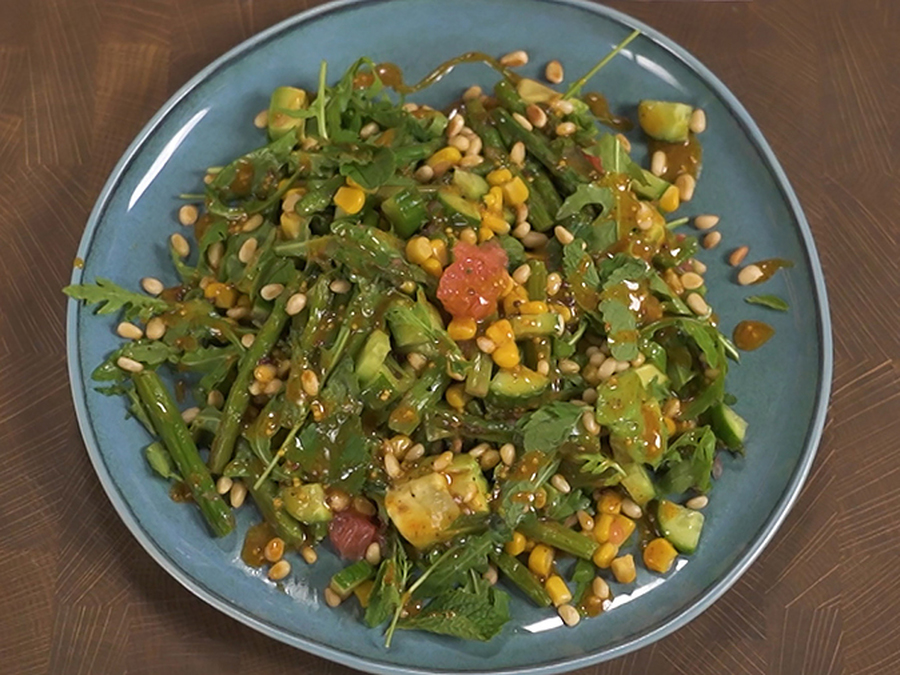 Немного лёгкости после новогоднего застолья даст салат со спаржей, авокадо, огурцами и кедровыми орехами. Пикантности блюду добавит медово-горчичный соус.