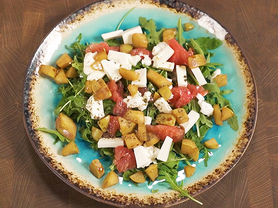 Попробуйте лёгкий салат с руколой, грейпфрутом, сладким и солёным сыром и грушей в кленовом сиропе. Аромата блюду придаст соус с лимоном и итальянскими травами.