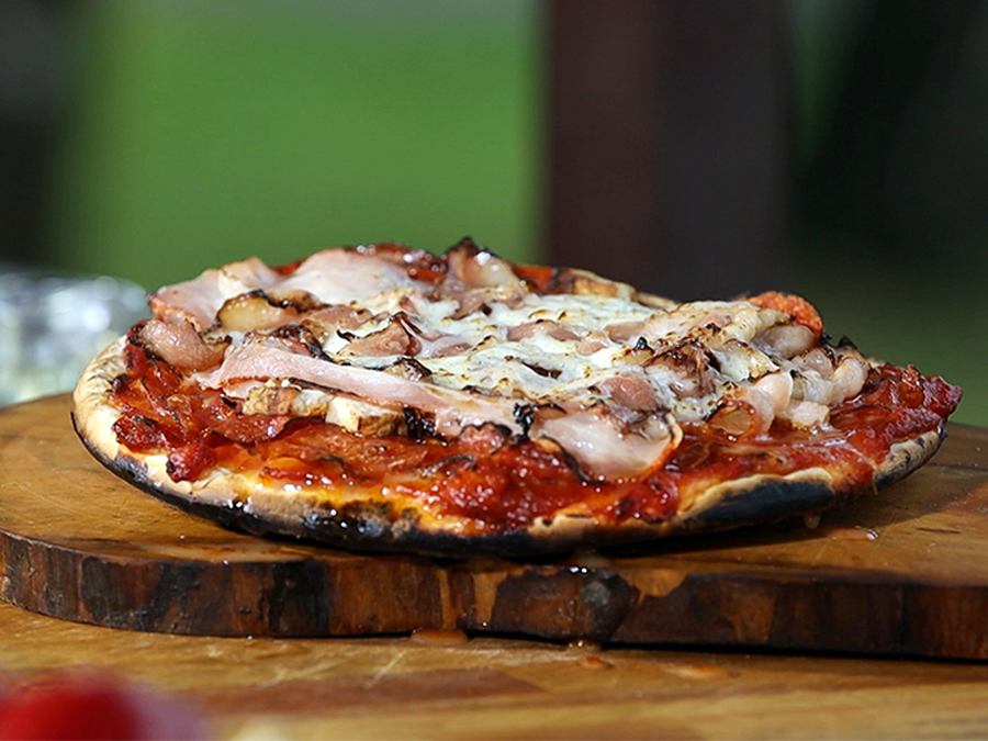Необычное блюдо приготовит на гриле наш шеф-повар. Попробуйте пиццу со стейком, томатами черри и болгарским перцем по рецепту из рубрики "Фуд-корт".
