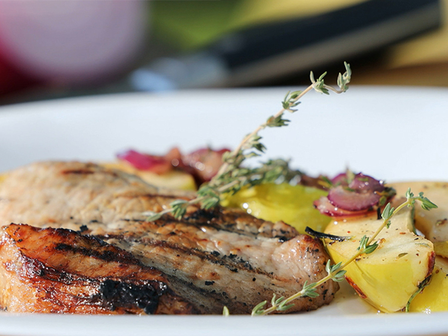 Мясо от нашего шеф-повара – это изысканный вкус блюда и его аппетитный вид. Рецепт свиных отбивных с печёными яблоками вы найдёте в рубрике "Фуд-корт".