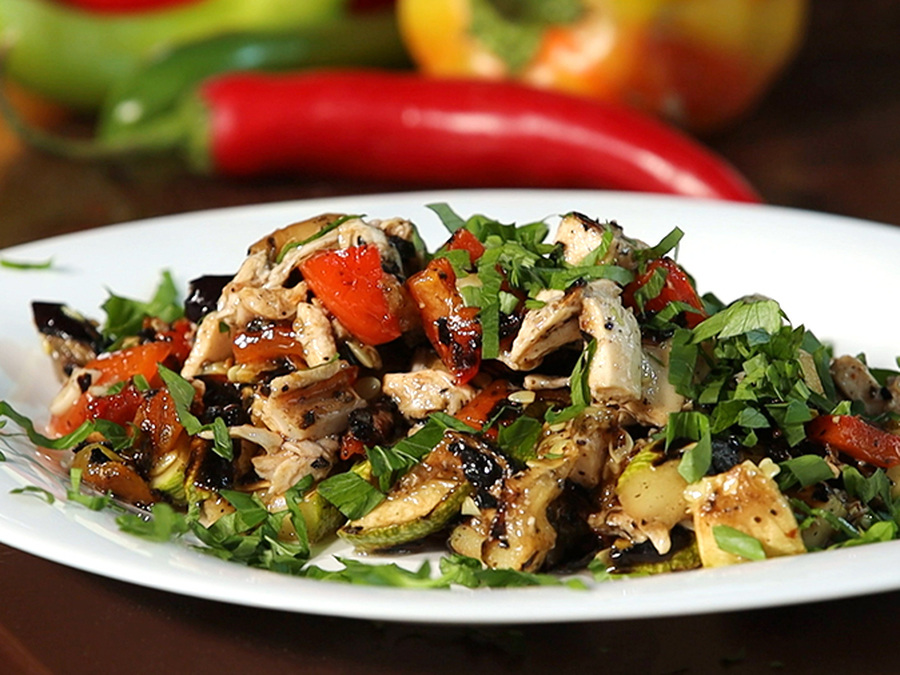 Простое, но очень вкусное блюдо приготовит наш шеф-повар. Попробуйте салат с болгарским перцем, баклажанами, кабачками и курицей по рецепту "Фуд-корта".
