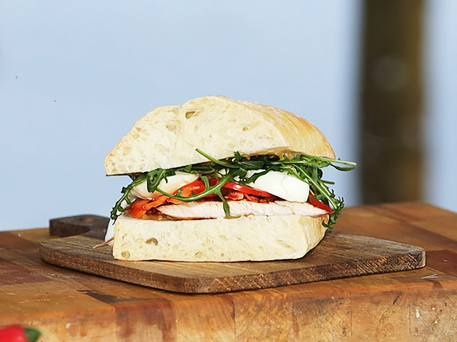 Сытное блюдо приготовит наш шеф-повар. Попробуйте сэндвич с куриной грудкой, беконом, сыром и вялеными томатами по рецепту "Фуд-корта".