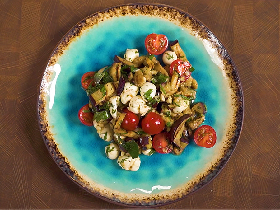 Вам понравится салат из запечённых баклажанов, томатов черри, укропа, петрушки и мяты, а также сыра моцарелла с медово-лимонным соусом.